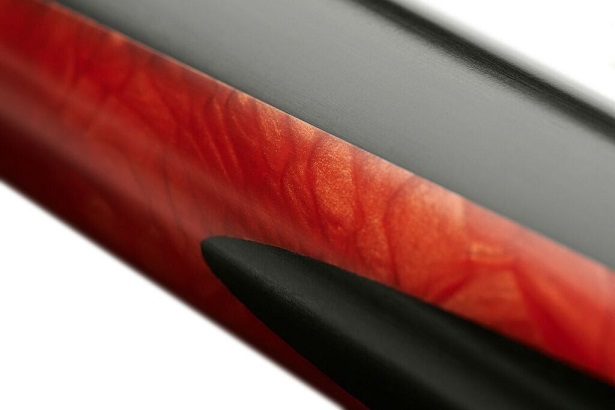 Ausgewähltes Eschenholz, handgefertigter Ebenholz Griff mit großem Frontspleiß aus Verbundwerkstoff mit Effektmusterung mit rotem Reptilien-Effekt