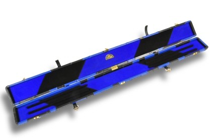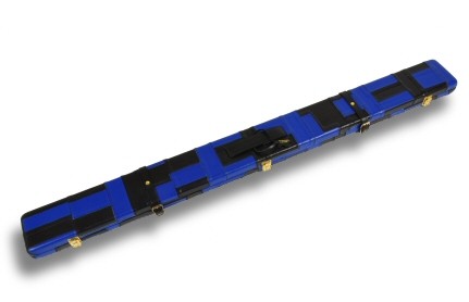 Koffer aus echtem Leder in Flickwerk-Optik erschaffen durch Schwarze und Blaue Lederstücke die individuell angeordnet sind. Mit gepolsterter Veloursleder Innenverkleidung. Platz für 3/4-geteilte Queues mit Verlängerungen, Kreiden und sonstiger Ausstattung.