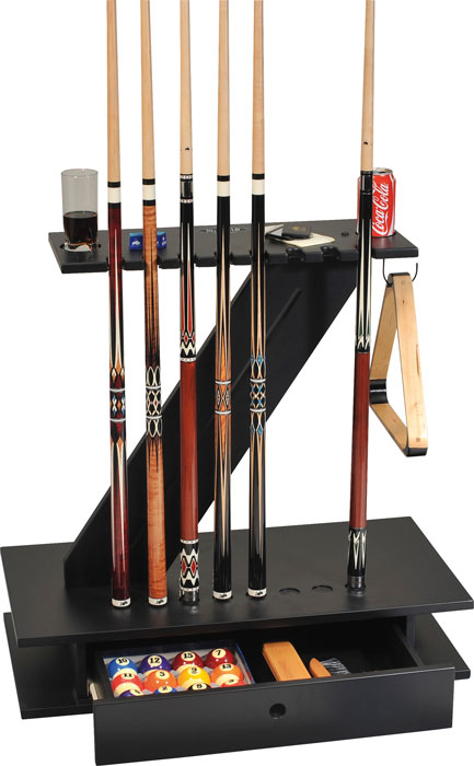 Original BUFFALO Bodenständer für 8 Queues in exklusivem, schwarzen Design. Mit zwei rutschfesten Abstellflächen für Getränke, Triangelaufnahme und leichtgängiger, schienengelagerter Schublade zur Aufbewahrung von komplettem Ballsatz, Tuchbürste und Zubehör.