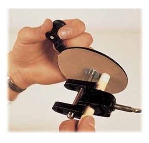 Wenn Sie das Queue einspannen, unbedingt etwas (Taschentuch oder Pappe) zwischen das Holz und das Eisen der Maschine klemmen, damit beim festziehen der Sicherungsschraube keine Kerben im Holz entstehen können!