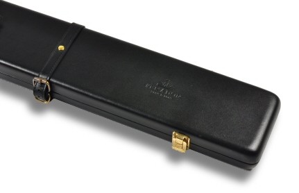 Handgemachter Koffer aus echtem Leder mit gepolsterter Veloursleder Innenverkleidung für 3/4-geteilte Queues mit Platz für Verlängerungen, Kreiden und sonstiger Ausstattung.